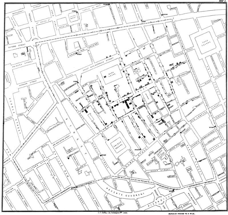 Snow později použil bodovou mapu k ilustraci shluku případů cholery kolem pumpy. Použil také statistiky k ilustraci souvislosti mezi kvalitou zdroje vody a případy cholery. Ukázal, že domy zásobované vodárnou Southwark and Vauxhall, která odebírala vodu z úseků Temže znečištěných odpadními vodami, měly čtrnáctkrát vyšší míru výskytu cholery než domy zásobované vodárnou Lambeth, která odebírala vodu z čistších studní Seething Wells na horním toku řeky. Snowova studie byla významnou událostí v historii veřejného zdraví a geografie. Je považována za zakládající událost vědy epidemiologie.