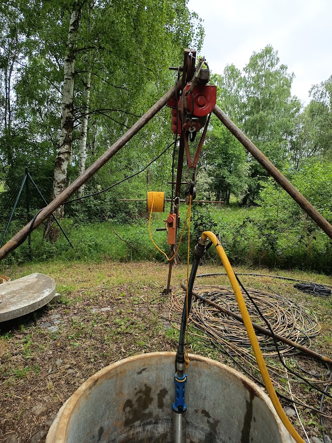 Čištění a údržba obecní vrtané studny, v tomto případě spojena s výměnou a opravou čerpadla ze studny v obci Vížina.
